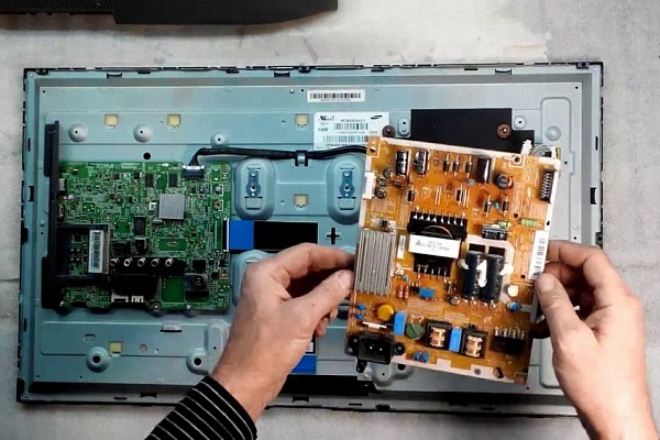 Важно: любые работы внутри корпуса телевизора, замена деталей блока питания (например, конденсаторов) требуют навыков и специальных инструментов!